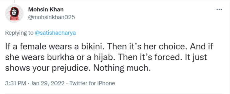 “If a female wears a bikini, then, it’s her choice. And if she wears burkha or a hijab, then it’s forced. It just shows your prejudice. Nothing much,” he claimed.