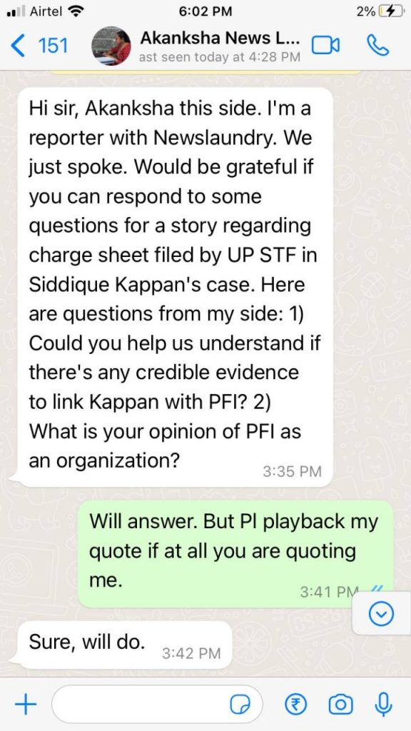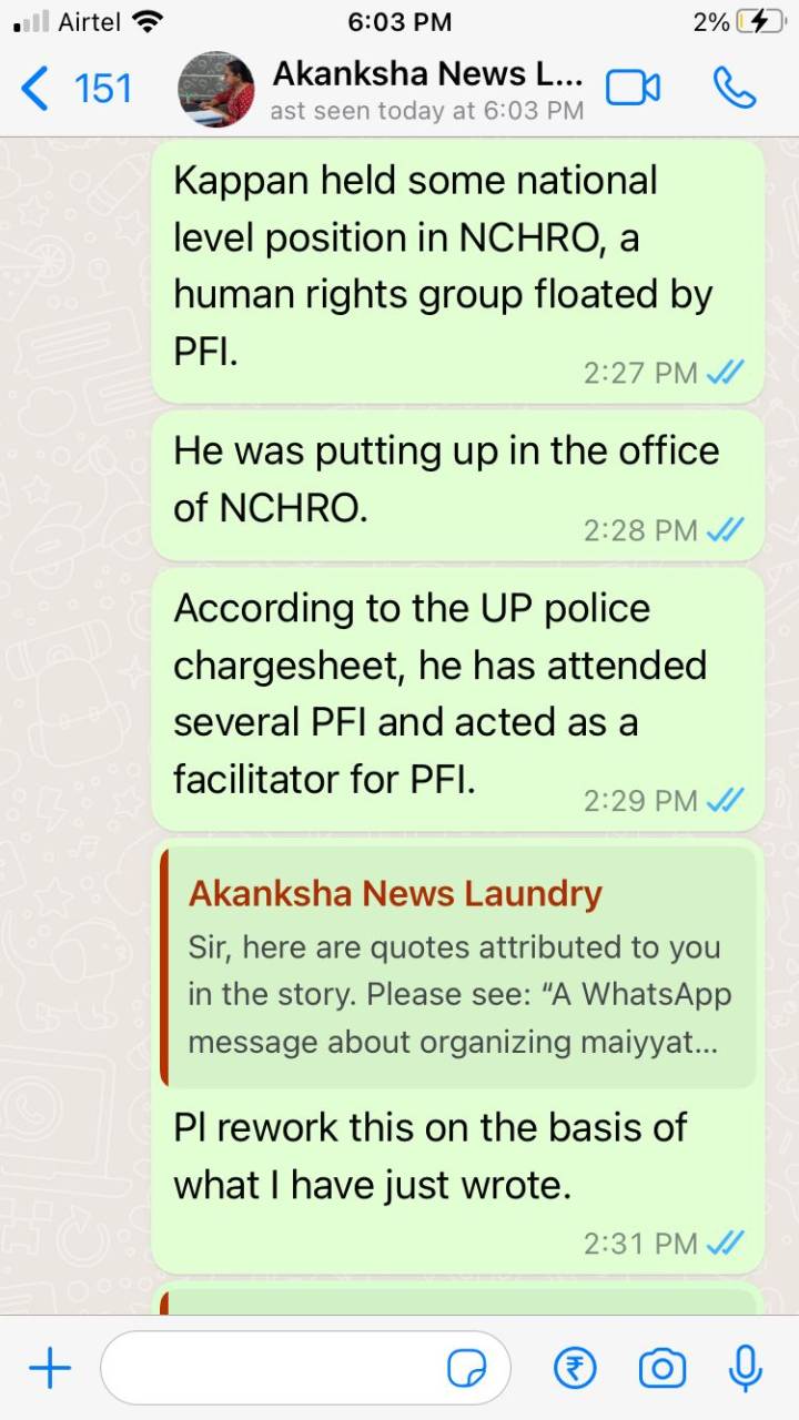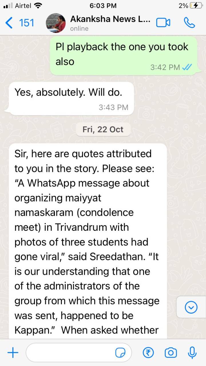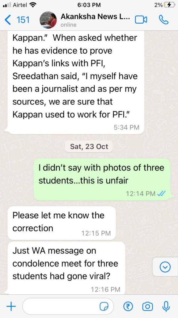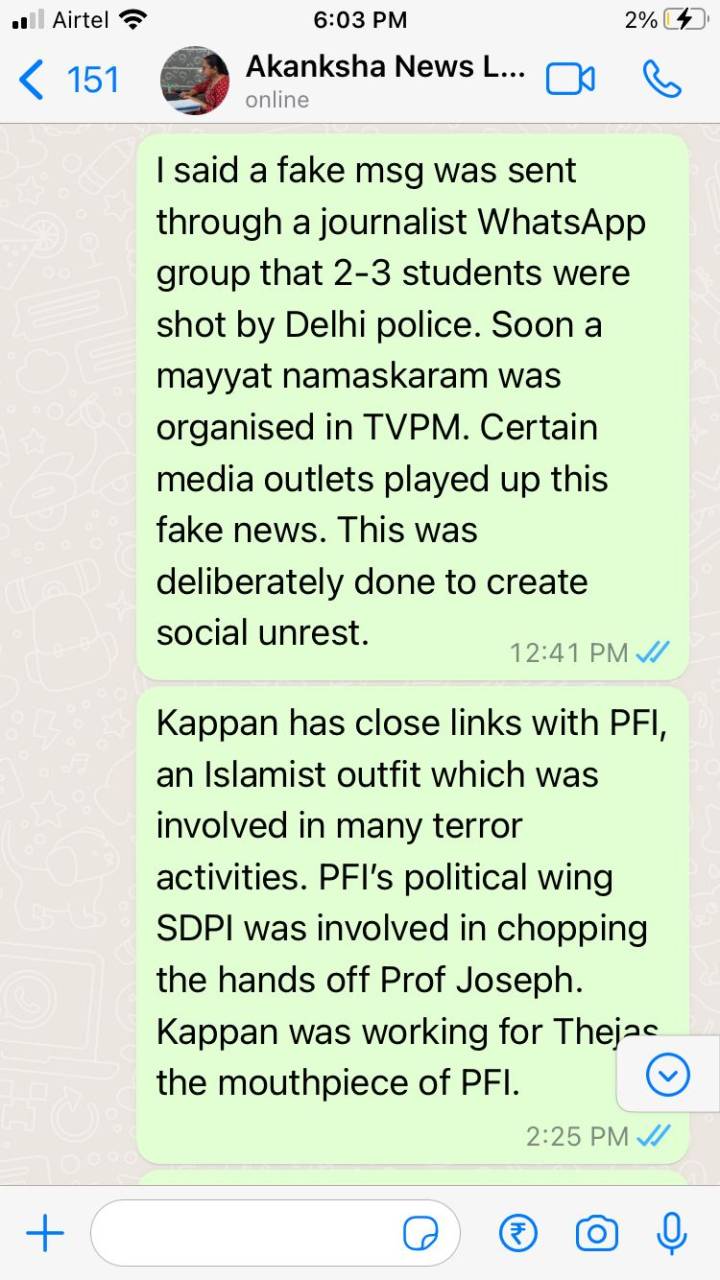 According to Indus Scrolls, before filing the report, Akansha had called up Sreedathan for his comments on the charge sheet and the Kappan reports published on his website. He had explained Kappan’s links with PFI. Since Sreedathan had expressed his reluctance to engage in a long conversation with her, Akansha sent Sreedathan some questions on Whatsapp and requested him to answer them.