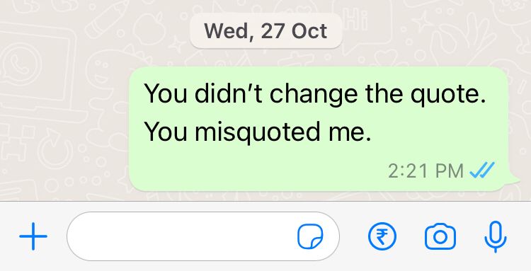 Indus Scrolls submitted screenshots of Sreedathan and Akansha Kumar’s Whatsapp conversation to show how Newslaundry’s writer misquoted Sreedathan and rejected his request to correct it.