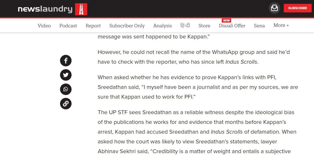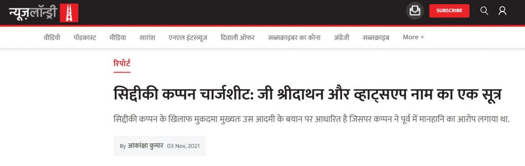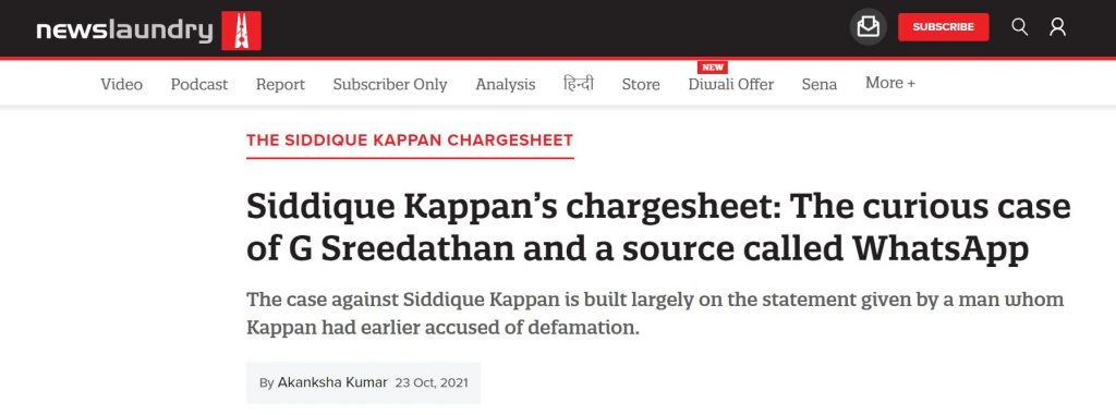 It may be noted that Newsluandry had on October 23, 2021, published an article titled: “Siddique Kappan’s chargesheet: The curious case of G Sreedathan and a source called WhatsApp”, written by Akansha Kumar. The archived version of the article can be viewed here.