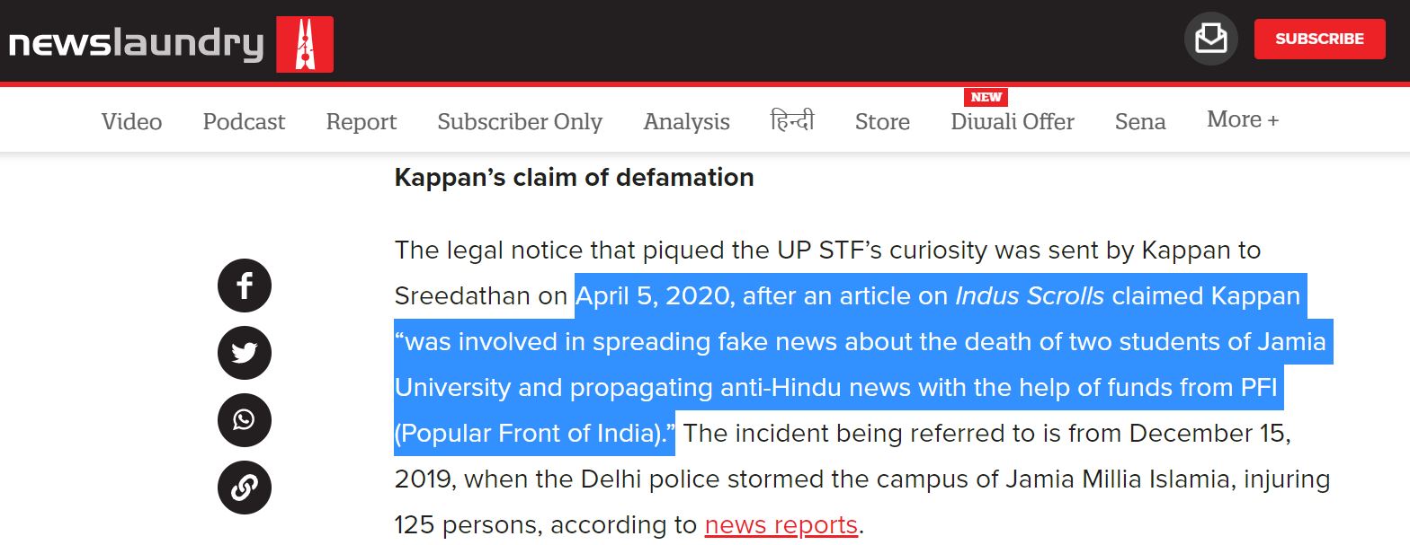 The Newlaundry report claims that Siddique Kappan had sent a legal notice to G Sreedathan, the founder of the website Indus Scrolls on April 5, 2020, “after an article on Indus Scrolls claimed Kappan was involved in spreading fake news about the death of two students of Jamia University and propagating anti-Hindu news with the help of funds from PFI (Popular Front of India).”