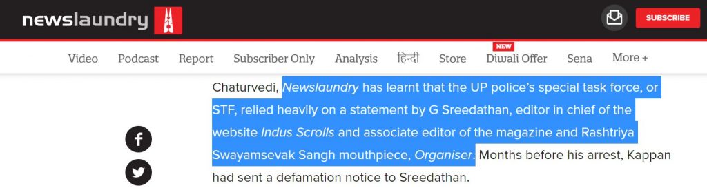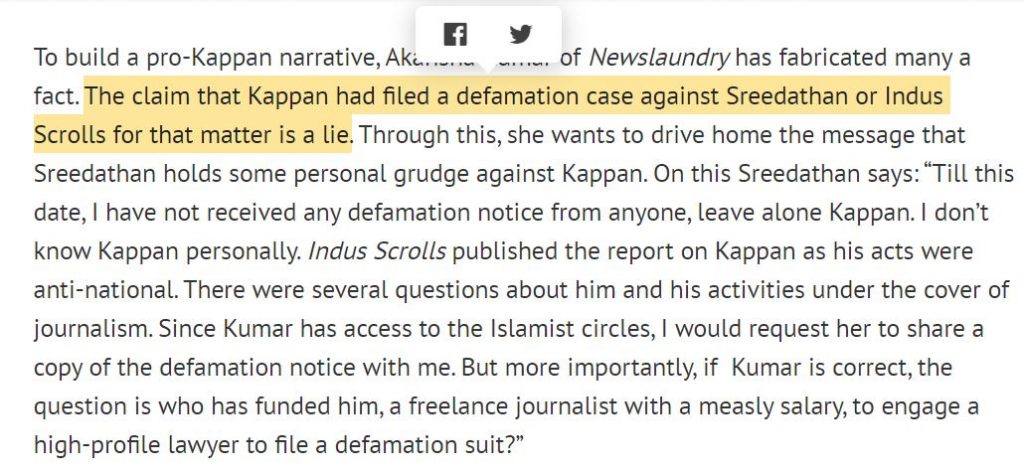 In the report, ‘journalist’ Akansh Kumar claimed: “Months before his arrest, Kappan had sent a defamation notice to Sreedathan”. The report further claimed that the UP police’s special task force had relied heavily on a statement by G Sreedathan, founder of the website Indus Scrolls.