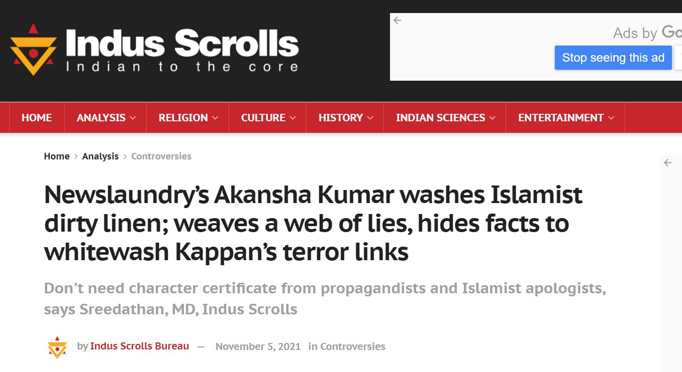 The article published by Indus Scrolls on November 5, 2021, headlined “Newslaundry’s Akansha Kumar washes Islamist dirty linen; weaves a web of lies, hides facts to whitewash Kappan’s terror links”, gives details of how Akansha Kumar, a ‘journalist’ working for far-left propaganda website Newslaundry distorted Sreedathan’s quotes to build a pro-Kappan narrative and hide Siddique Kappan’s terror links.