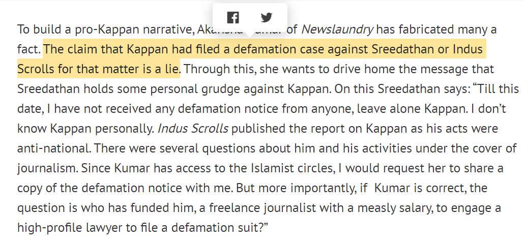 The article by Indus Scrolls firstly negated the claim made by the Newslaundry journalist that Kappan had filed a defamation case against Sreedathan or Indus Scrolls. Through this, she wants to drive home the message that Sreedathan holds some personal grudge against Kappan, further, sharing Sreedathan’s take on the matter.