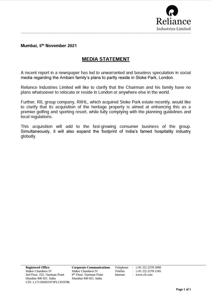 The statement read, “Reliance Industries Limited will like to clarify that the Chairman and his family have no plans whatsoever to relocate or reside in London or anywhere else in the world. RIL group company, RIIHL, which acquired Stoke Park estate recently, would like to clarify that its acquisition of the heritage property is aimed at enhancing this as a premier golfing & sporting resort, while fully complying with the planning guidelines & local regulations. This acquisition will add to the fast-growing consumer business of the group. Simultaneously, it will also expand the footprint of India’s famed hospitality industry globally”.
