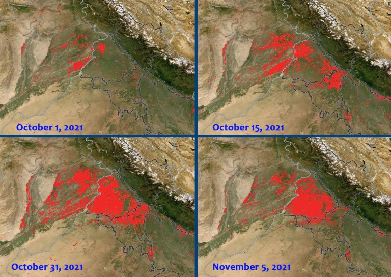 NASA has used red dots to indicate incidents of fire caught by satellites. A look at the maps from 31st October and 5th November show that almost the entire state of Punjab was covered with red dots, which meant that crop residues were burnt at almost all the farmland in the state before Diwali. Similarly, a large portion of Haryana was also covered with such red dots indicating fire.