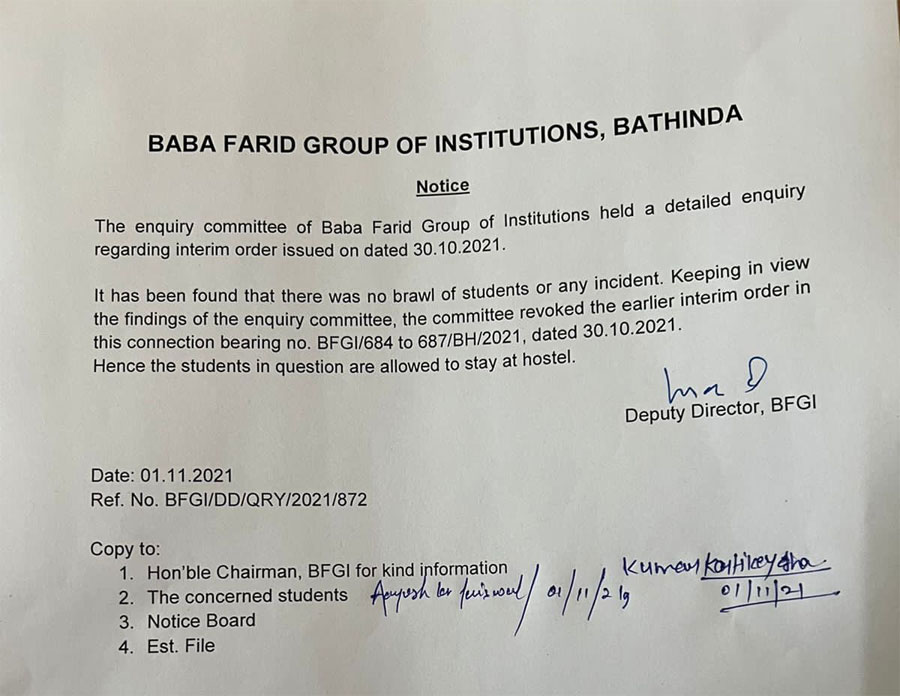 The new order by the committee reads, “The enquiry committee of Baba Farid Group of Institutions held a detailed enquiry regarding interim order issued on dated 30.10.2021.