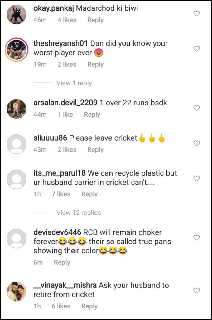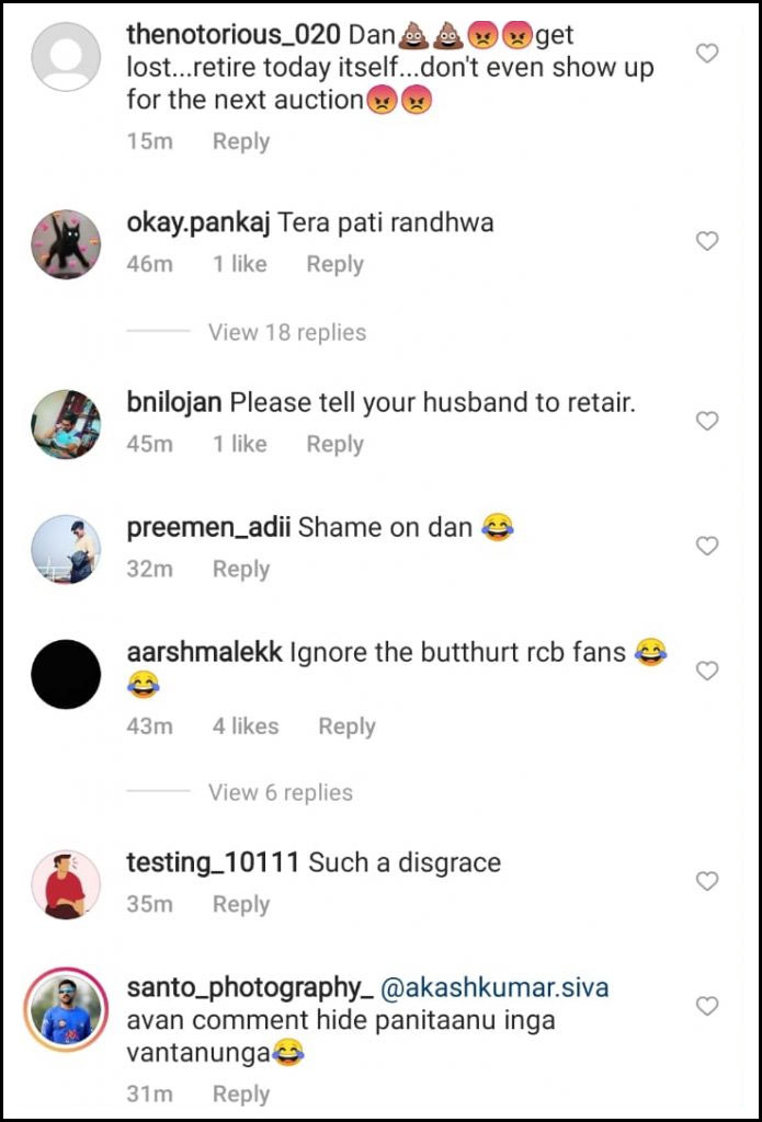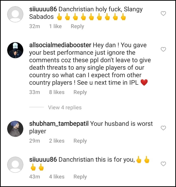 Daniel Christian made only nine runs and did not take any wicket while giving away 29 runs in 1.4 overs. His performance attracted a score of abuses against his wife Jorgia Dunn.