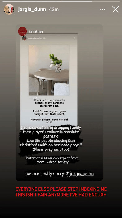 In an Instagram story, Christian wrote, “Check out the comments section of my partner’s Instagram post. I didn’t have a great game tonight, but that’s sport. However please leave her out of it.” Quoting his story, his wife wrote, “Everyone else please stop inboxing me. This isn’t fair anymore. I have had enough.” Her post showed how much abuse she got not only on her Instagram post but also in her Instagram Inbox.