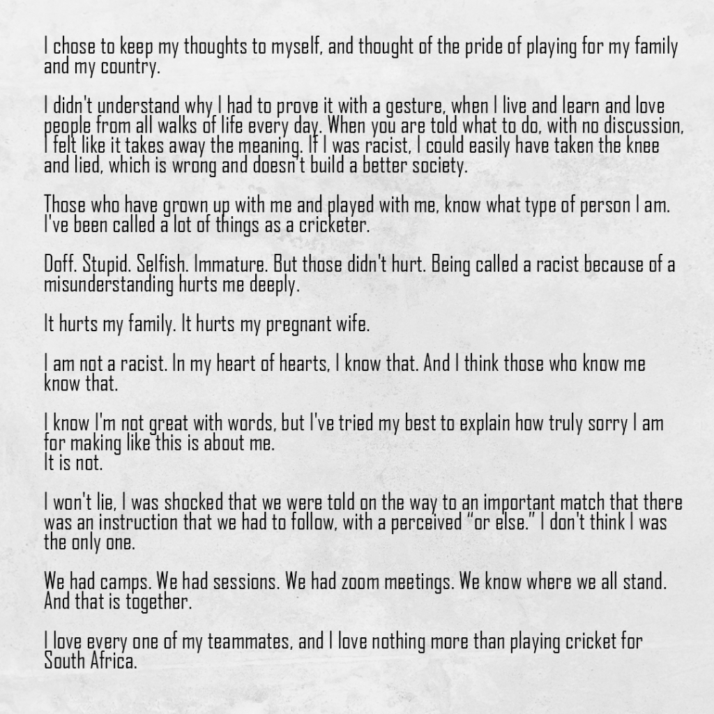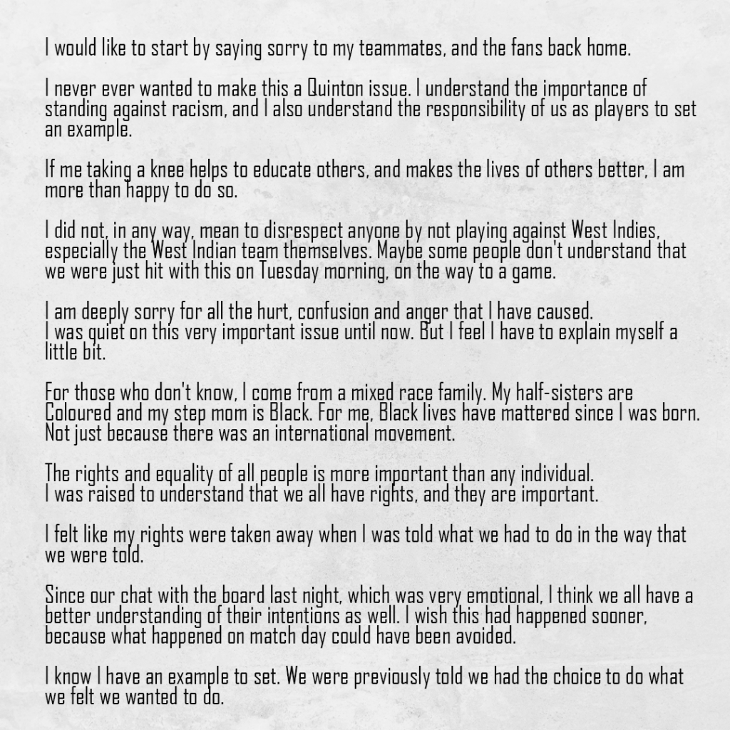 “I’ve been called a lot of things as a cricketer. Doff. Stupid. Selfish. Immature. But those didn’t hurt. Being called a racist because of a misunderstanding hurts me deeply. It hurts my family. It hurts my pregnant wife. I am not a racist. In my heart of hearts, I know that. And I think those who know me know that,” de Kock stated.