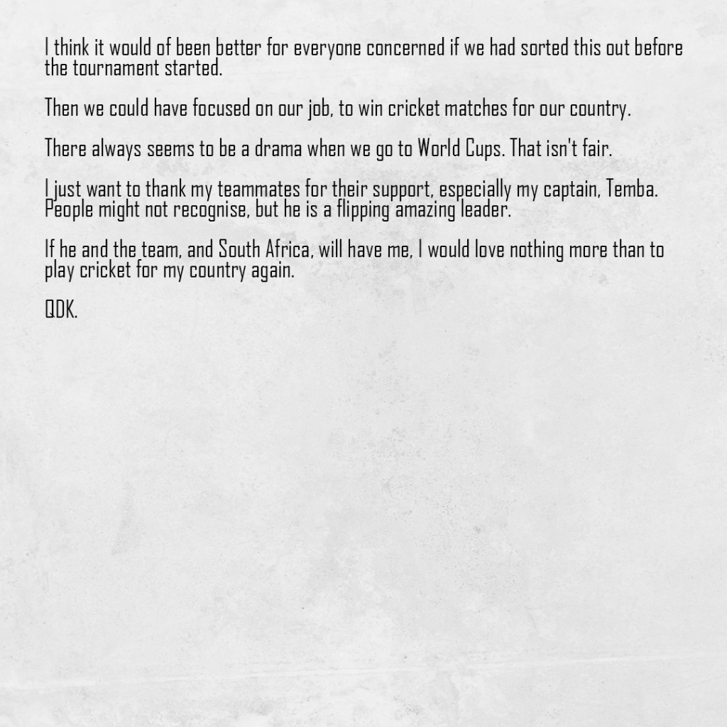Bavuma had stated, “As far as we stand, Quinton is still one of the players. He’s still one of the boys, so whatever support that he needs, whatever shoulder that he requires from his teammates, we’ll be there for him.”
