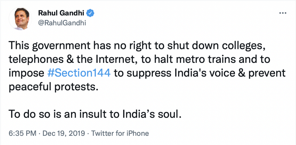 Congress prince Rahul Gandhi had stated shutting down the internet is like suppressing India’s voice. He had added that the government suspending the internet is an ‘insult to India’s soul’.