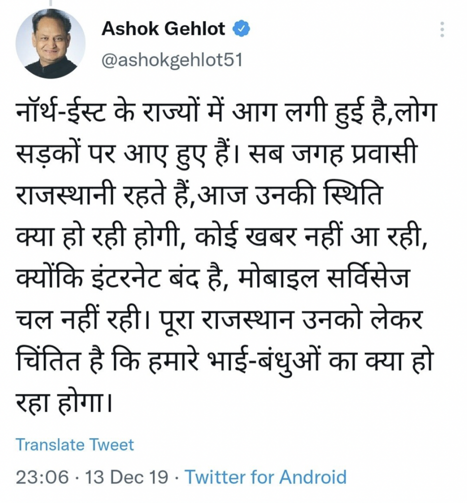 Gehlot tweet in December 2019 was about the suspension of internet services in some other states of India due to the protests against CAA. He was ‘worried’ that Rajasthani people stay in those states and with mobile internet suspended they cannot contact home. He had expressed concerns regarding the safety and well being of those people stating that his government is worried over the suspension of mobile internet services.