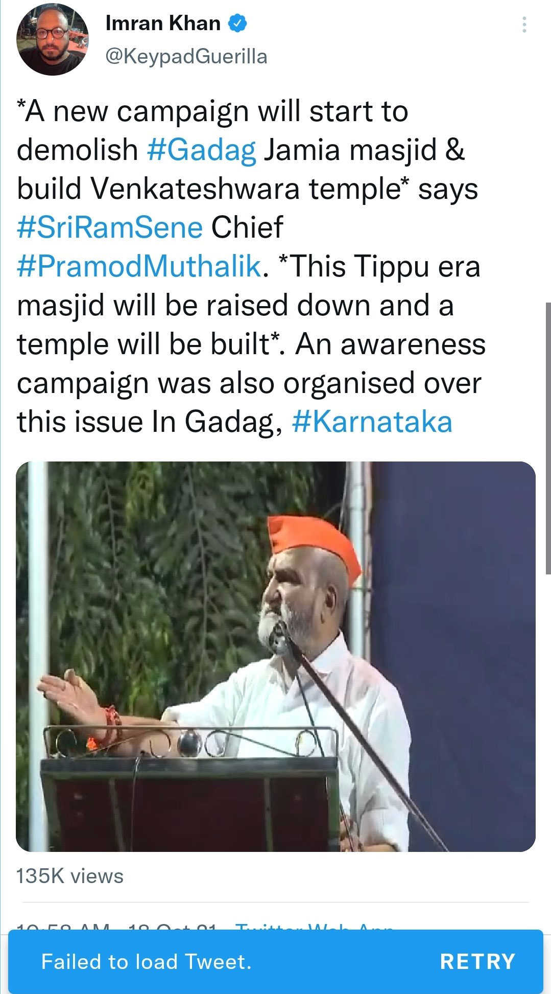 In his tweet, Khan had alleged in the video he had shared, Muthalik was talking about starting a new campaign to demolish Gadag Jamia Masjid. His tweet was based on the wrong translation of Muthalik’s speech that he had delivered in Kannada.
