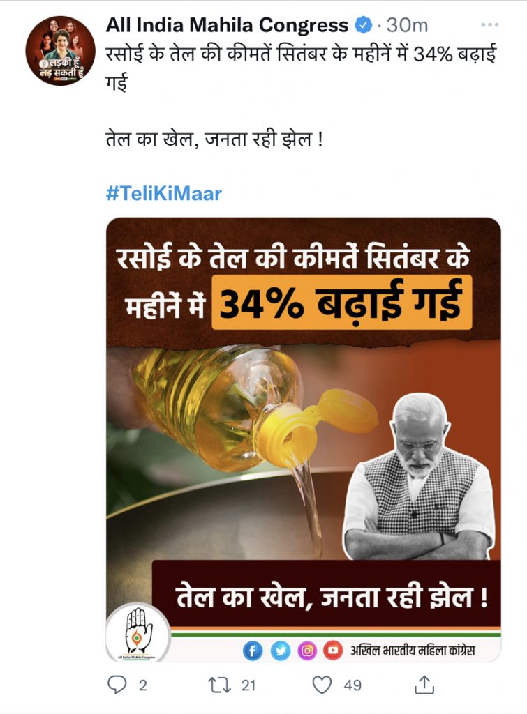 Along with the patently casteist hashtag, the All India Mahila Congress shared an infographic saying the prices of edible oil have skyrocketed by 34 per cent in the month of September.