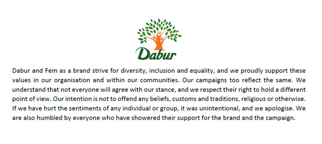 Dabur said in a statement on social media, “Dabur and Fem as a brand strive for diversity, inclusion and equality, and we proudly support these values in our organisation and within our communities. Our campaigns too reflect the same. We understand that not everyone will agree with our stance, and we respect their right to hold a different point of view. Our intention is not to offend any beliefs, customs and traditions, religious or otherwise. If we have hurt the sentiments of any individual or group, it was unintentional, and we apologise. We are also humbled by everyone who have showered their support for the brand and the campaign.”