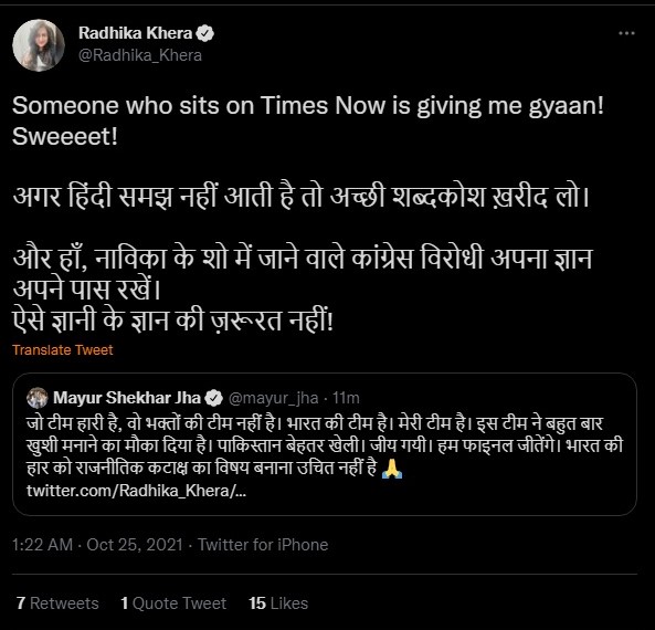 When a fellow Congress party member reminder her that the Indian team that lost to Pakistan did not belong to ‘Bhakts’ alone, the Congress national media coordinator mocked him saying that someone who appears on Times Now was giving her advise.