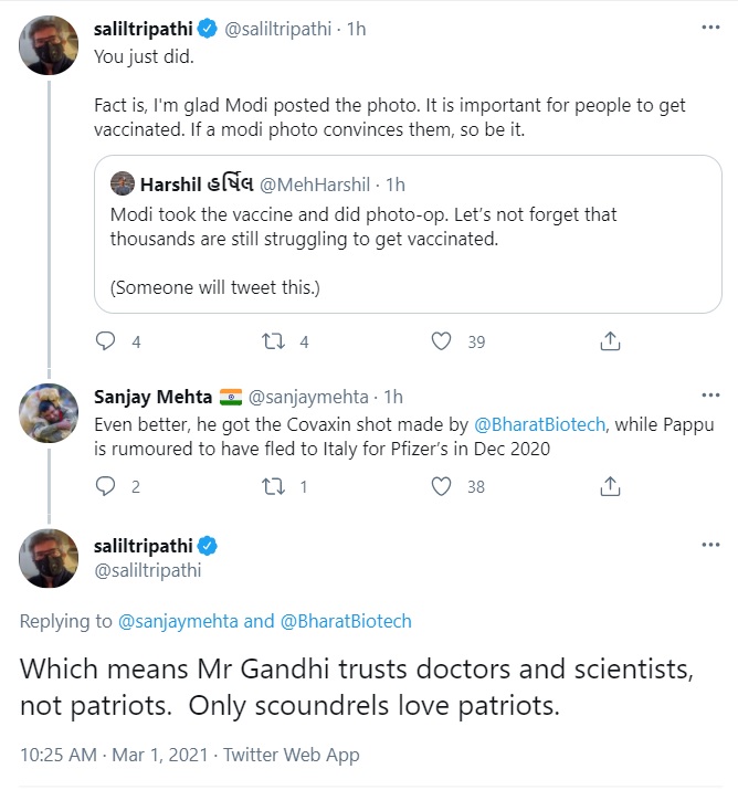 Salil Tripathi, who claims to be a journalist and often refers to himself as an intellectual, initially agreed that it was good that PM Modi posted the photo as it would make people get vaccinated. If a Modi photo convinces them, so be it, he said.