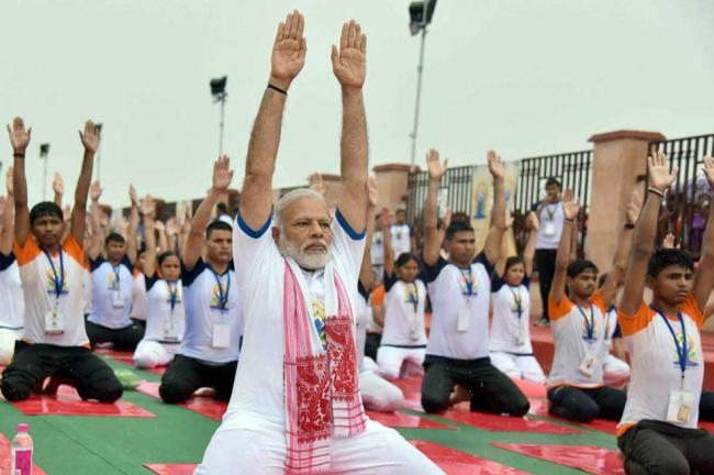 2017 Yoga Day image of PM Modi donning Assamese Gamosa