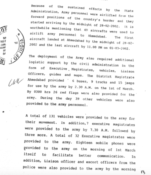 The note says Army personnel were airlifted by using about 40 aircrafts from the border and landed in Ahmedabad by 28th February midnight. 6 buses, 9 trucks and 15 jeeps were sent for use by the Army by 2:30 am on 1st March 2002. During the day 39 additional vehicles were provided. A total of 131 vehicles were provided to the Army. Additional executive magistrates were provided to the Army. Escort officers from the police force were provided to the Army.