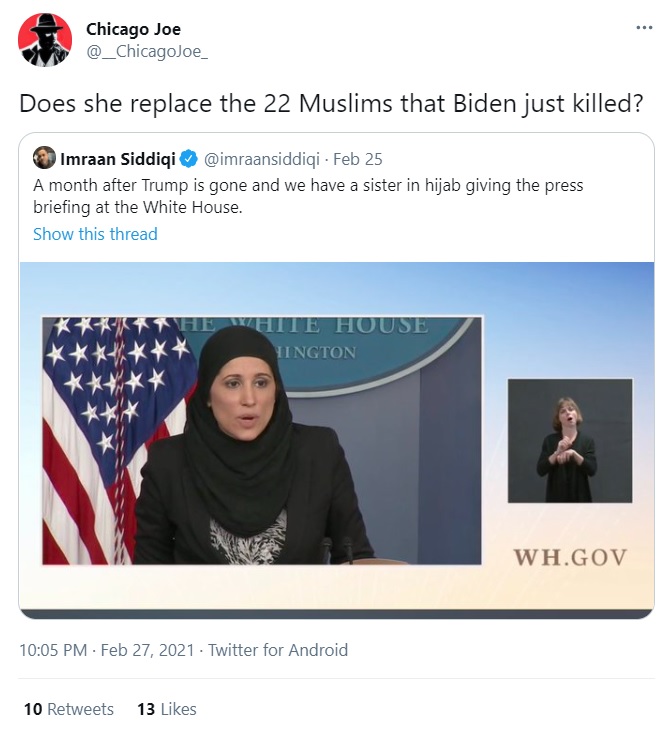 Another user asked whether the ‘hijab’-clad Fazili replaced the 22 Muslims that Biden had killed in the recent past.