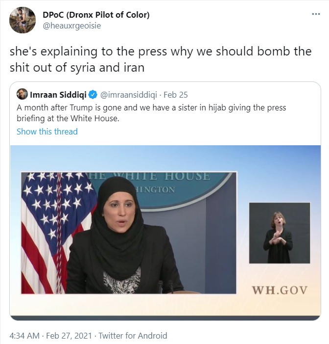Several social media users had a field day on Thursday, who mocked Biden administration and its supporters for propping up the ‘Hijabi’ woman Sameera Fazili at a press conference just a day after bombing innocent Muslims in Syria. The US had carried out airstrikes in Syria, targeting groups affiliated with an Iran-backed militia in retaliation to rocket attacks on American troops in northern Iraq.