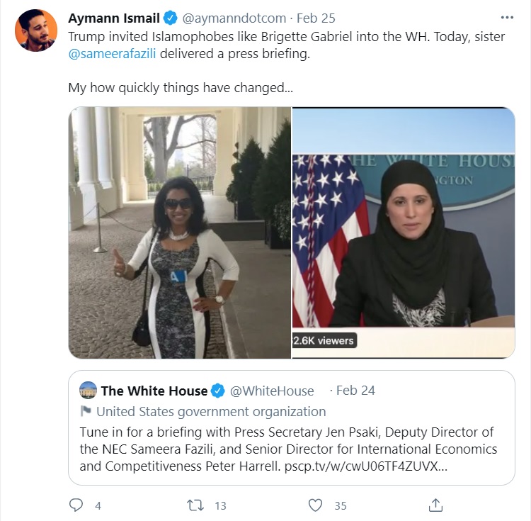 One user Aymann Ismail wrote, “Trump invited Islamophobes like Brigette Gabriel into the WH. Today, sister @sameerafazili delivered a press briefing”.