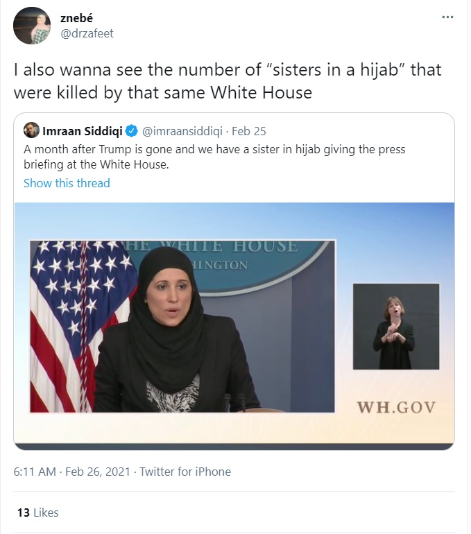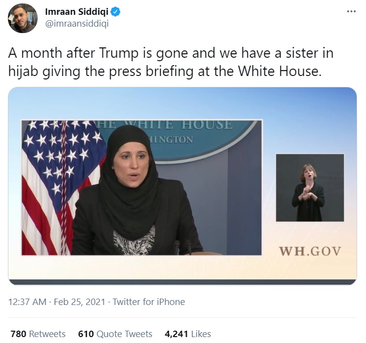 Another Twitter user Imraan Siddiqui said, “A month after Trump is gone and we have a sister in hijab giving the press briefing at the White House”.