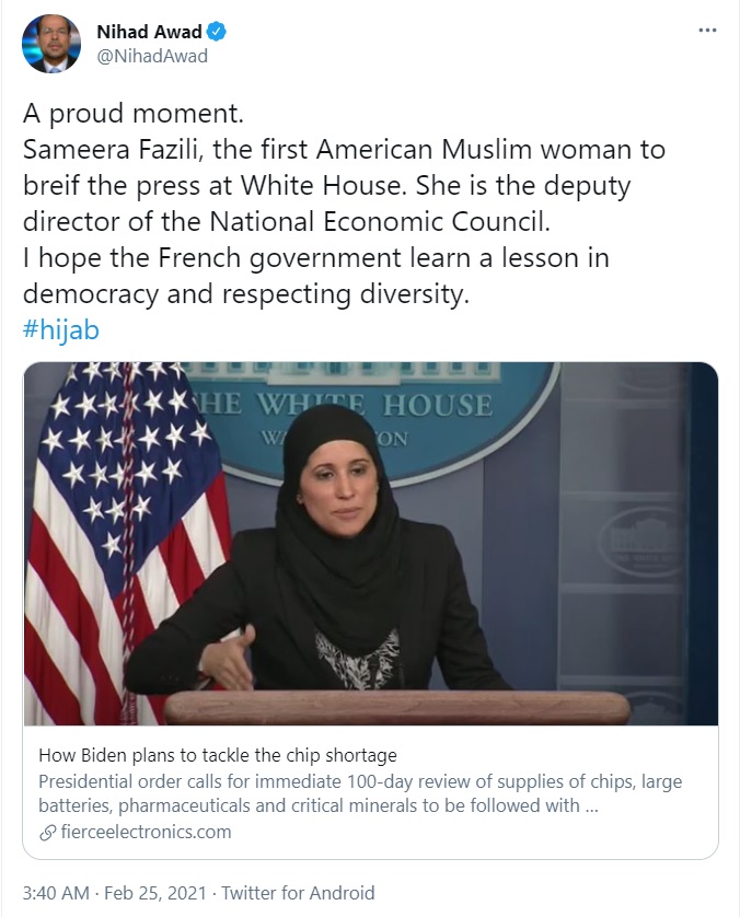 “A proud moment. Sameera Fazili, the first American Muslim woman to brief the press at White House. She is the deputy director of the National Economic Council. I hope the French government learn a lesson in democracy and respecting diversity. #hijab”, wrote Nihad Awad, the Chief of radical Islamic organisation CAIR.