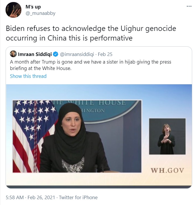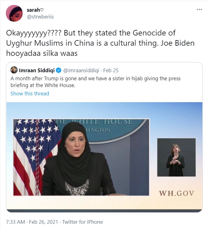 A social media user Sarah pointed out how Biden refuses to recognise the persecution of Uyghur Muslims by China and calls it a ‘cultural thing’, while his administration indulges in photo-ops with ‘Hijabi’ women to claim they respect ‘diversity’.