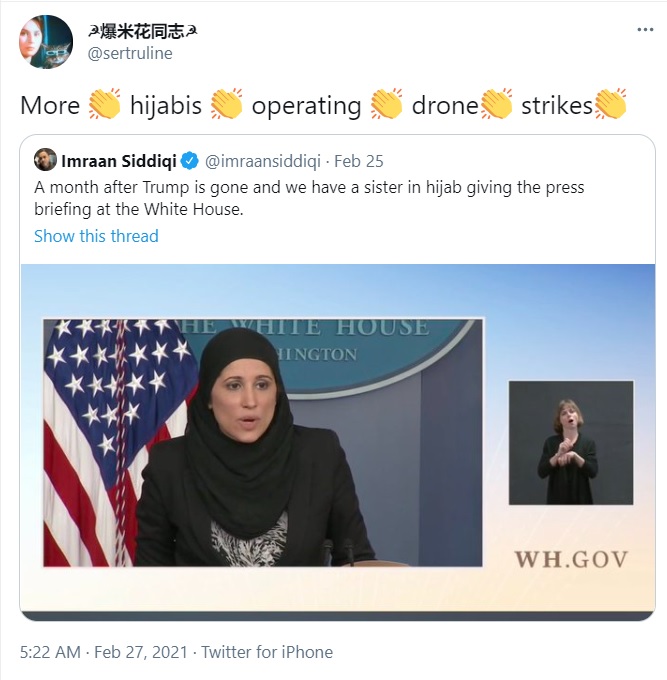 Exposing the hypocrisy of the ‘Muslim appeasement’ of Biden administration, a user said that more ‘Hijabi’ women are operating drone strikes now.