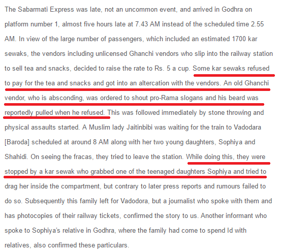 Apparently, Karsevaks were burnt alive for refusing to pay for their tea and snacks. One of the many “Independent fact-finding missions” the kinds which have Harsh Mander in their team, published this. No proof, no evidence, just ‘informants’. The ‘liberals’ did not think twice before spreading rumours about the dead Karsevaks, did not hesitate to paint them as hateful bigots and eveteasers and thereby responsible for their own death.