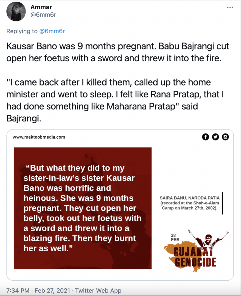 Tweet claiming Babu Bajrangi perpetrated the heinous act on Kausar Bano