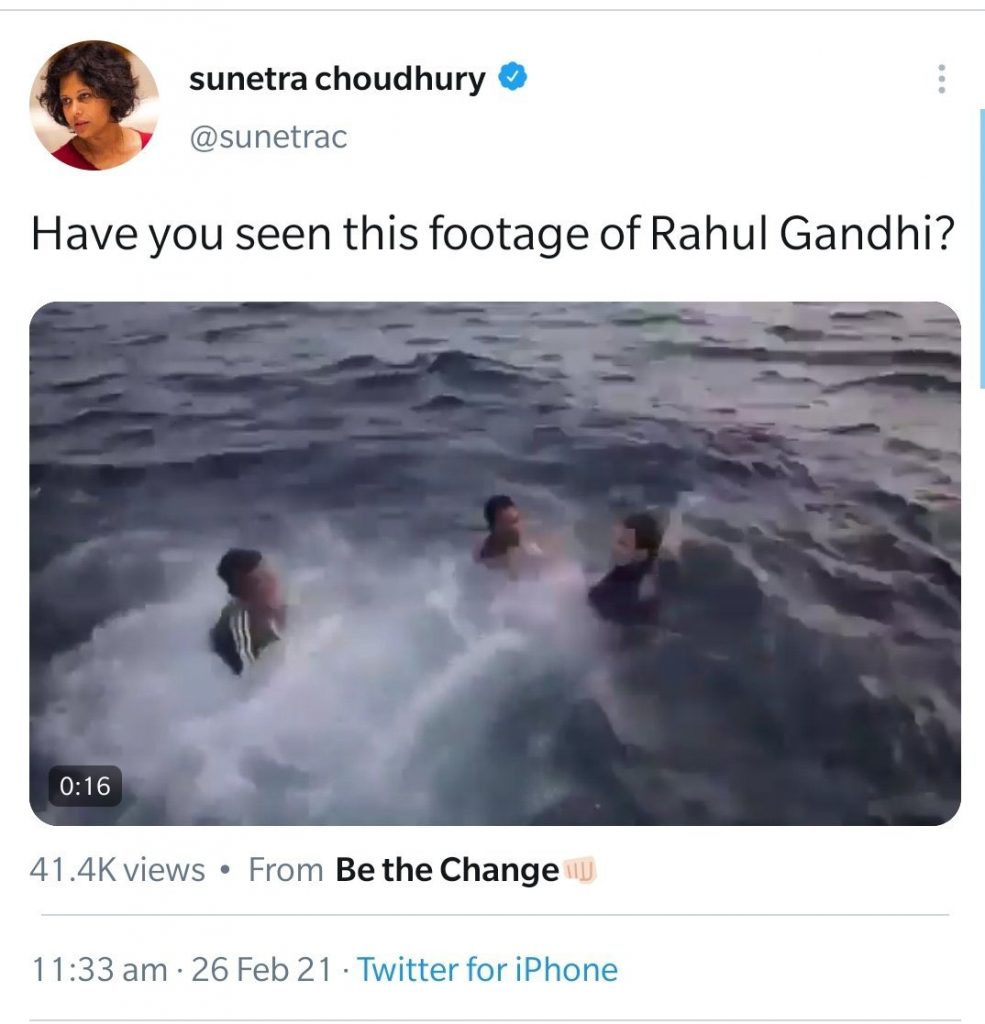 Sunetra Choudhury, a former NDTV anchor who now works with Hindustan Times, was in awe of Rahul Gandhi’s swimming event in Kerala. Instead of challenging Rahul Gandhi over his repeated lies over ‘Fishing Ministry’ or confronting him on the allegations of the staged event, Sunetra Choudhury asked her followers on social media whether someone had seen the footage of Rahul Gandhi.