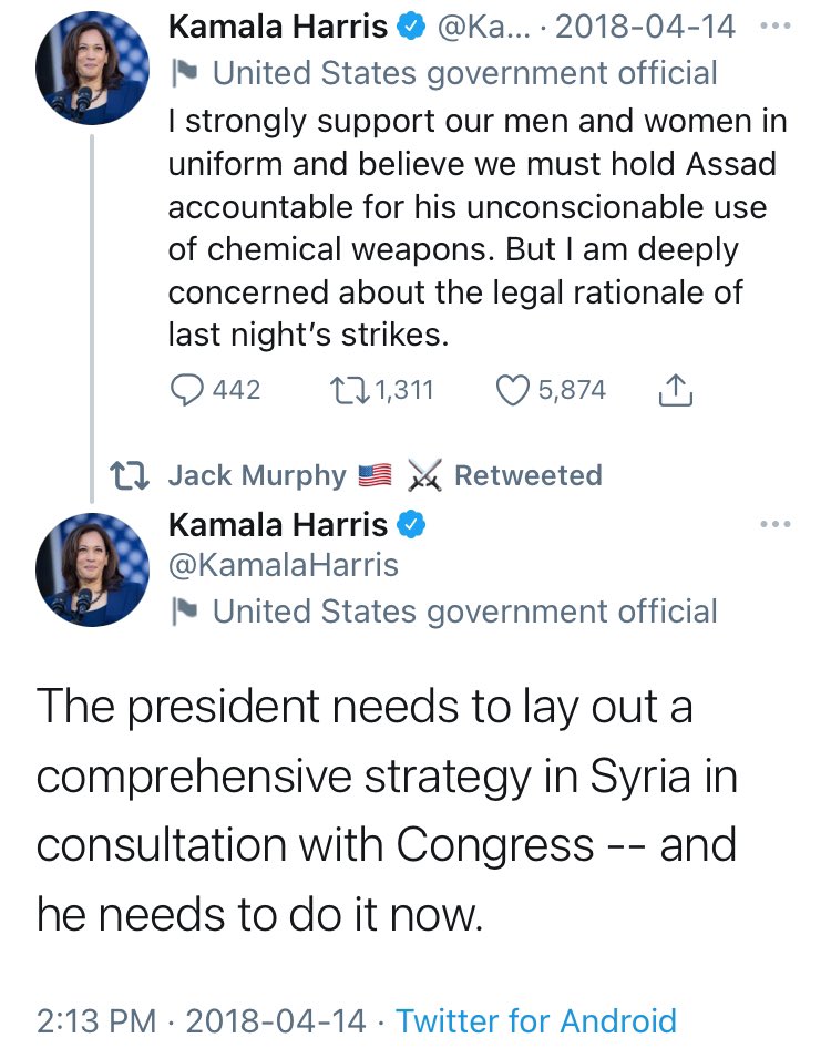 Mr. Biden’s Vice President, Kamala Harris also had to face the music over her 2018 tweets, in which she had questioned the “legal rationale” of the then President Trump’s airstrikes and exhorted Trump to lay out “comprehensive strategy in consultation with Congress.” It is to be noted that Joe Biden has not yet ‘consulted’ the U.S. Congress about a Syria policy.