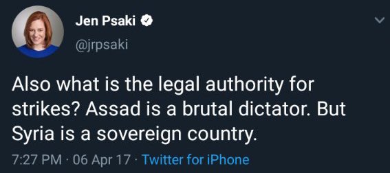 Influential U.S. Conservative and Republican, Jack Posobiec called out W.H. Press Secretary Jen Psaki on Twitter for a tweet dating April 2017 in which she had questioned the authority of the United States to launch airstrikes into a sovereign country like Syria. The context for Jen Psaki’s tweet was the then U.S. President Donald Trump authorizing airstrikes in Syria in retaliation to Bashar al-Assad’s alleged chemical weapon attacks on Syrian civilians. The response from Mr. Posobiec simply reads, “Great Question, Jen!”