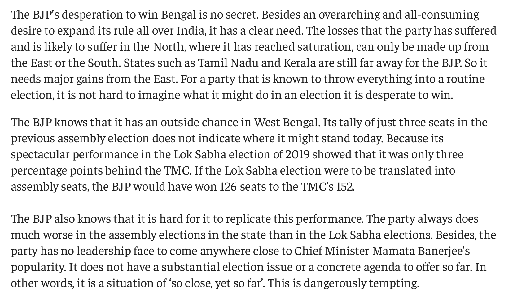 Essentially, in this article, Yogendra Yadav is dog-whistling. He is laying down every asinine argument that would be used by his cabal to cry hoarse after the Assembly Elections. If the BJP makes inroads or wins, they would say it was because BJP bought the votes, the EC was partisan, the governor was partisan and the Modi government crushed dissent with paramilitary forces (this would of course mean that the forces did not let TMC, Congress or the Left indulge in violence and rig the elections).