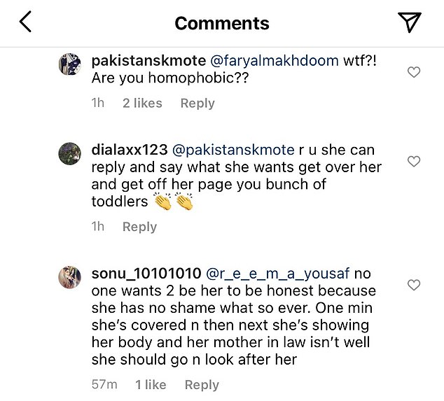 One Instagram user also accused her of posing while covering full body in one picture while wearing revealing outfits in other when she should be taking care of her ill mother in law instead, since not doing so is ‘haram’ in Islam.