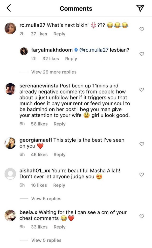 A fan of Faryal posted a comment on her image saying, “What’s next, bikini?’ alongside a bikini emoji.”