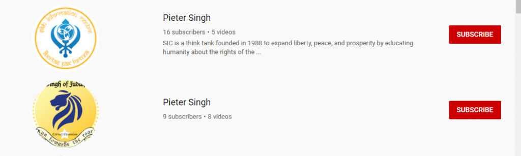 The two channels Friedrich created under the name of ‘Pieter Singh’ in 2013. Channels contain videos of both Pieter and Bhinder