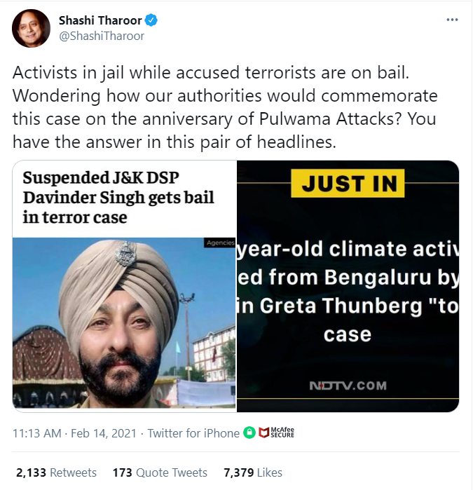 The Congress leader shared two news headlines, one highlighting the arrest of Disha Ravi on Saturday and the other pointing out the bail handed over to terror-accused suspended Jammu and Kashmir DSP Davinder Singh. Shashi Tharoor tried to draw a false equivalence between the two cases to suggest that while those with terror charges are scout-free, the government is somehow rounding up ‘activists’ in jail.