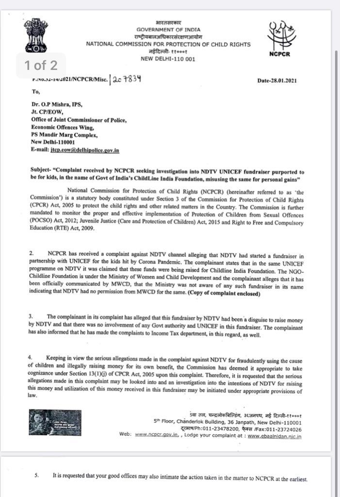 In his letter to NCPCR, the complainant has alleged that the purported fundraiser initiated by NDTV was nothing but a fraudulent way to use cause of kids to illegally raise money for its own benefit.
