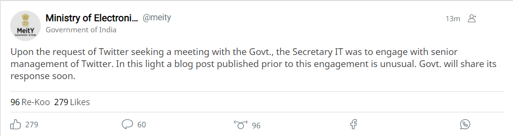 “Upon the request of Twitter seeking a meeting with the Govt., the Secretary IT was to engage with senior management of Twitter. In this light a blog post published prior to this engagement is unusual. Govt. will share its response soon,” posted MEITY through its Koo account.