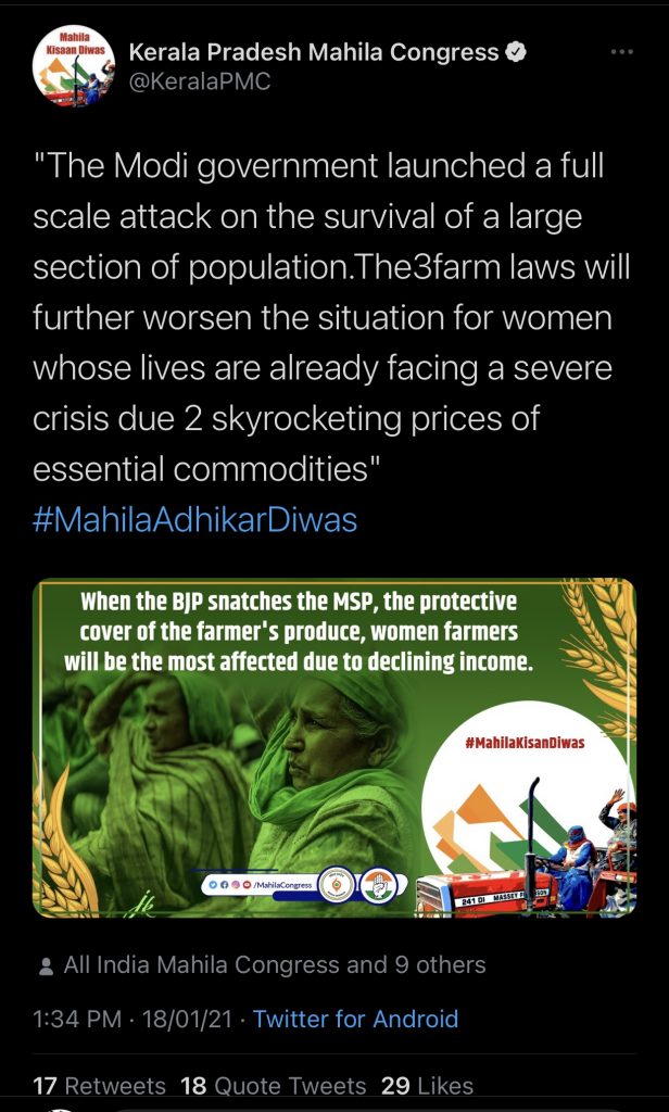 On the 18th of January, Kerala Congress tweeted about the farmer protests. The tweet, which has now been deleted, said, “The Modi government launched a full scale attack on the survival of a large section of population. The3farm laws will further worsen the situation for women whose lives are already facing severe crisis due to skytocketing prices of essential commodities” #MahilaAdhikarDiwas”.