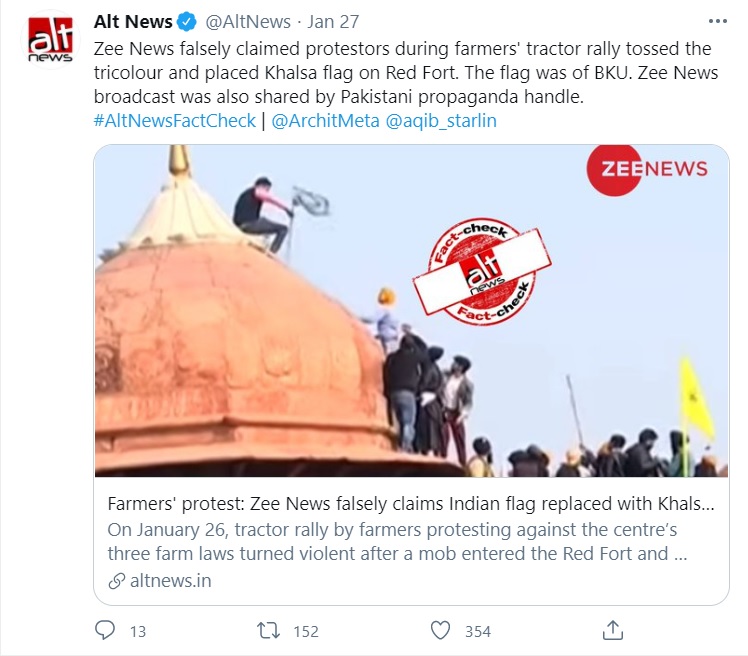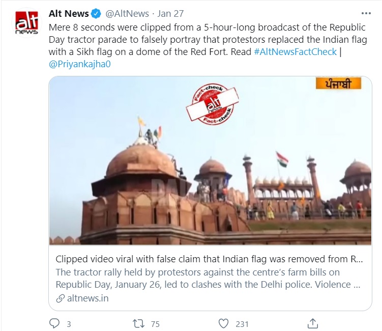 Alt-News, which has a notorious history of falsifying facts to spin the narrative, has published a series of ‘fact-check’ to claim that rioters did not desecrate the tricolour on the Republic Day.