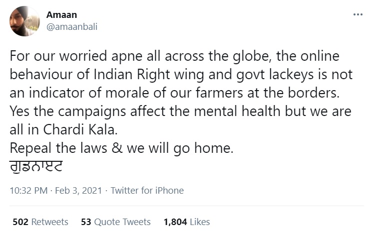 Amaan Bali also tweeted on Wednesday, just hours after ‘Greta Files’ were revealed in the public, to claim that the Indian government’s collective effort to fight the propaganda against the country will only boost the morale of ‘farmers’.