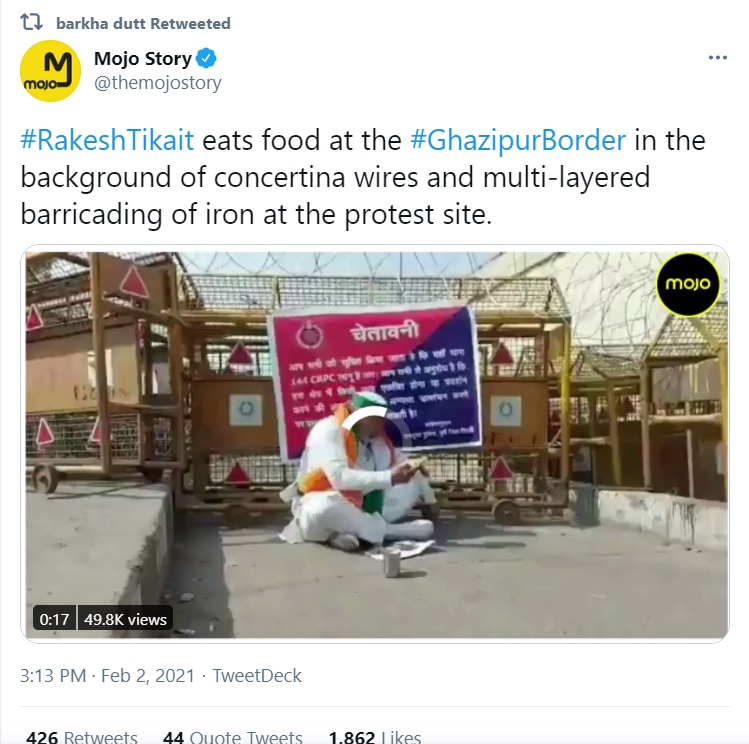Rakesh Tikait was talking to the media at the Ghazipur border. He inquired about the foreign artists who had shown ‘solidarity’ with his anti-farm law agitation. “Kaun hain ye videshi kalaakar? (Who are these people?),” the ‘farmer’ leader asked. He added, “Koi videshi agar samarthan kar raha to kya dikkat hai, kuch le-de thodi na raha hai (If a foreigner is supporting our protest, then what is the problem? We are not receiving or giving them anything.)”