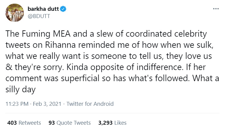 Here is a tweet of Barkha Dutt, where she strangely attacks the Indian government for commenting on foreign interference by Rihanna.