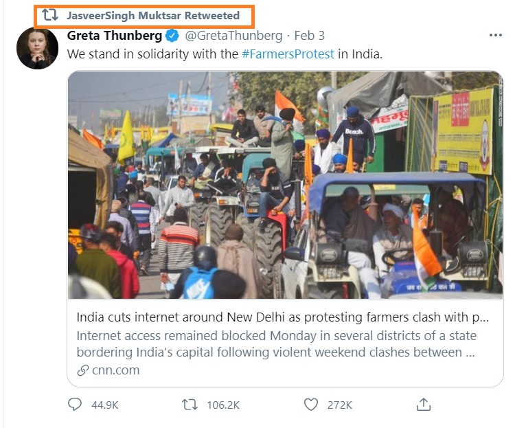 As expected, the Past Packer has been recognised by the child protestor Greta Thunberg and has allowed to propagte more lies about the Indian government.