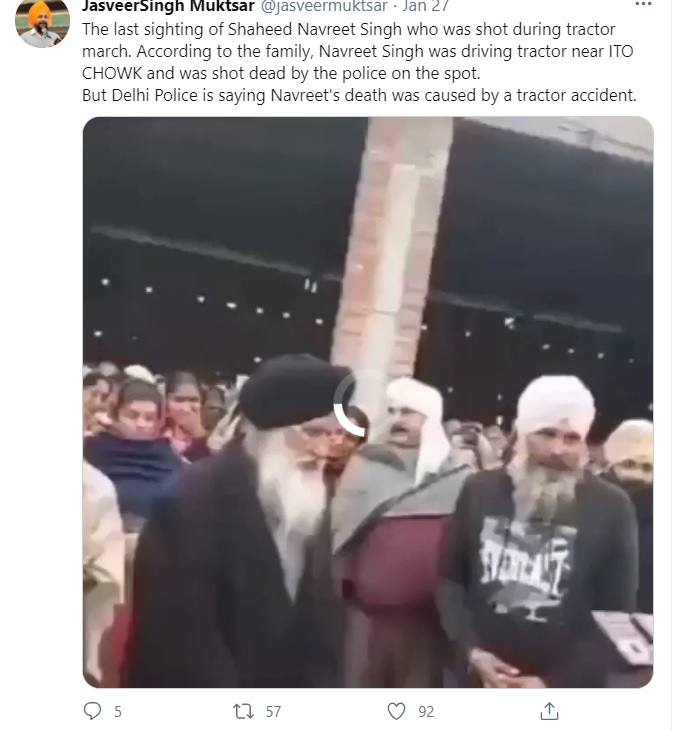 Jasveer Singh has also been tweeting fake news about the death of a rioter Navneet Singh, who died after his tractor turtled during the Republic Day riots. Singh has been claiming that the Delhi police shot the deceased rioter. However, it is a blatant lie as post mortem report rejects claims of a gunshot.